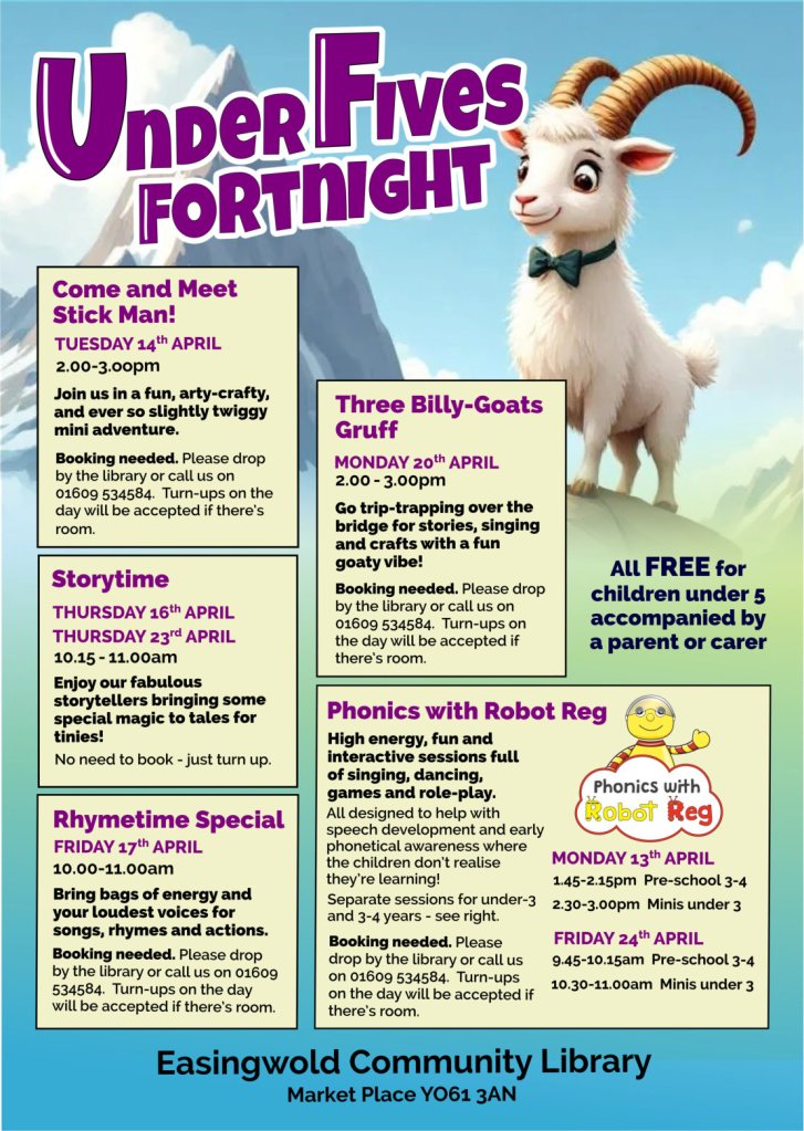 Three Billy Goats Gruff – Monday 20th April. 2.00pm to 3.00pm. Go trip-trapping over the bridge for stories, singing and crafts with a fun goaty vibe. And we’ve even given the troll the afternoon off! Booking is needed.