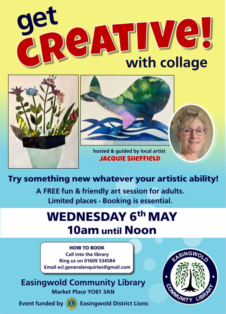 The session is on Wednesday 6th May from 10am until Noon. It’s kindly being funded by Easingwold District Lions and is FREE. There are limited places so if you fancy airing those hidden artistic leanings you’ll need to book by calling into the library or giving us a ring on 01609 534584.