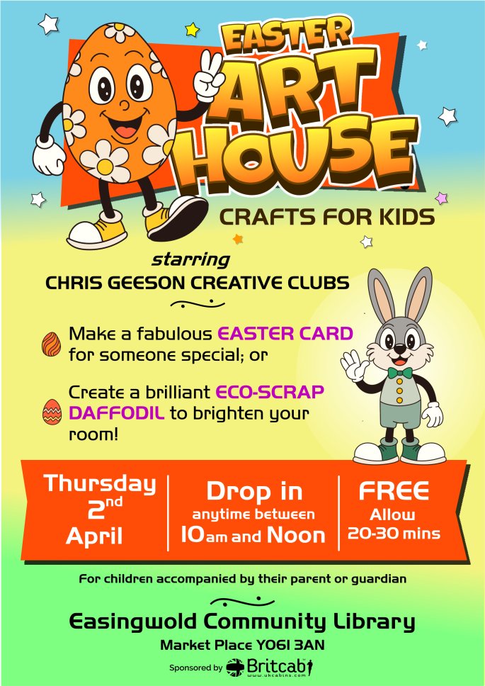 Easter Art House -hosted by the legend that is Chris Geeson Creative Clubs – is on Thursday 2nd April. Visit the library anytime between 10am and Noon to try your hand at making a fabulous Easter card or a beautiful eco-scrap daffodil to brighten your room.